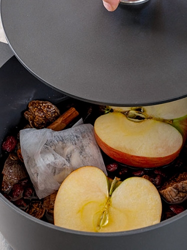 鍋に1.の材料を入れ、シナモンスティック、ワインを加えて蓋をする。中火で3分加熱し、その後トロ火で25分煮る(※)。