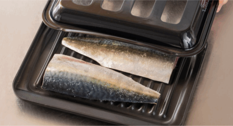 ▼01のさばを皮を上にしてココットプレートに並べ、蓋をしてグリルへ入れる。「自動調理をスタート」ボタンを押し、点火する。