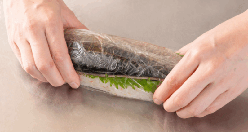 ▼05をラップできつめに包み、軽く押さえながら棒状に形を整える。