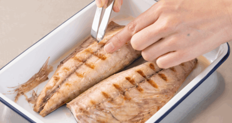 ▼02が焼き上がったらバットなどに出して粗熱を取り、骨を取り除く。