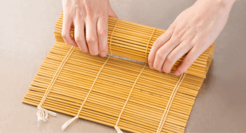 ▼06を巻きすにのせ、きゅっと締めて形を整える。もう1本も同様に作り、30分以上おいて具材と酢飯をなじませる。
