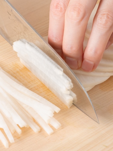 ▼01 大根は皮ごと3mm幅の輪切りにしてから千切りにし、ボウルに入れて塩を全体に混ぜる。舞茸はほぐし、しめじは石突きを取って小房に分ける。