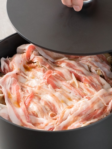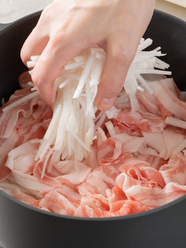 ▼02鍋に▼01の大根、豚肉、きのこ類、豚肉の順に広げ入れる。22cmの場合は、大根と豚肉を2回重ねてからきのこ類、豚肉を入れる。