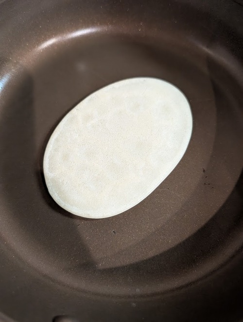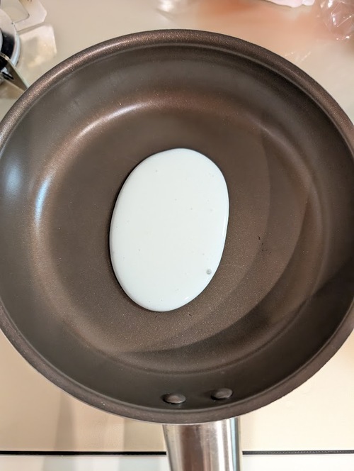 フッ素加工のフライパンを点火して150℃に設定する。 150℃になったら、②の生地を長さ約9~10cmの小判型に流して2分焼く(継ぎ足しせずに一度で流すのがポイント)。