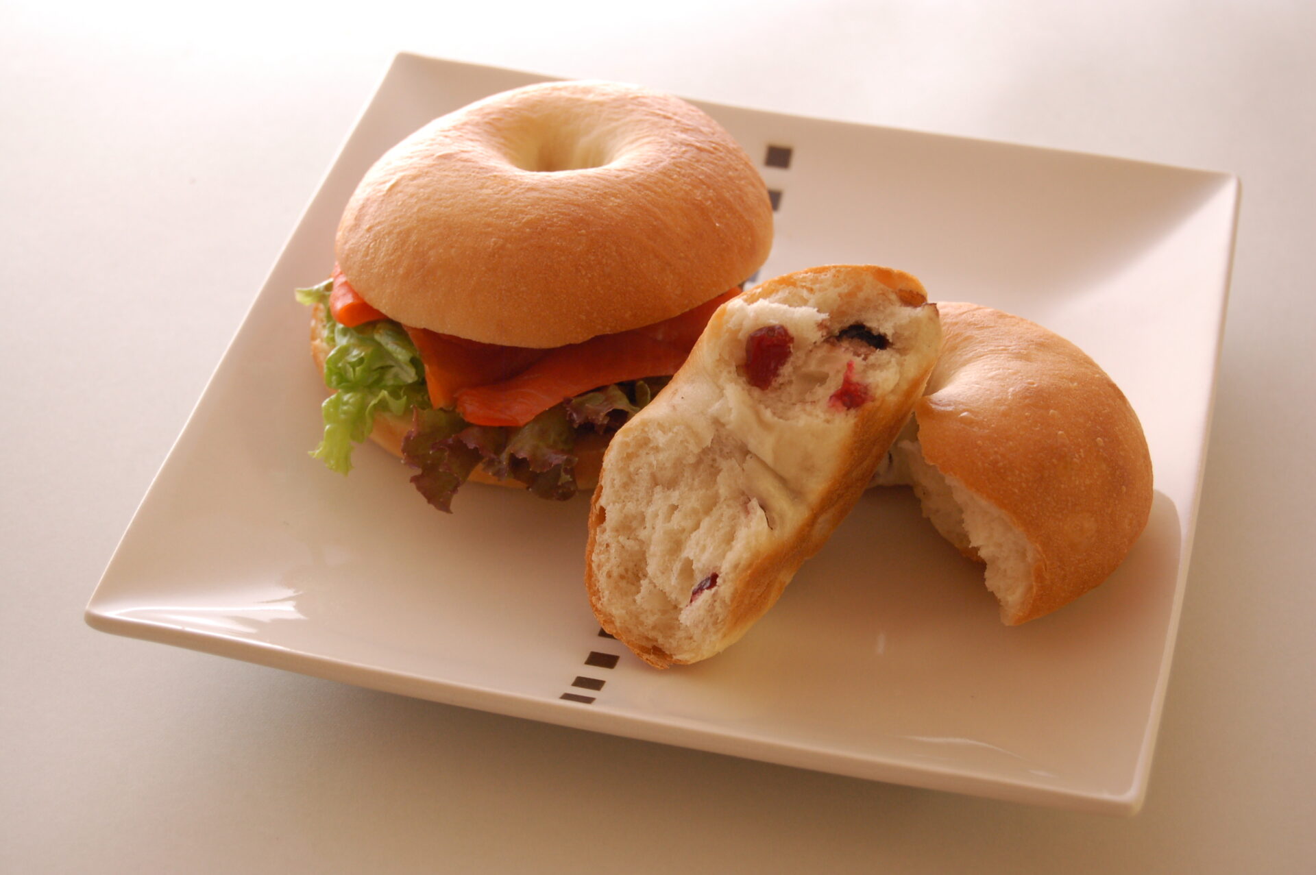 プレーンは横半分に切り、クリームチーズを塗って葉野菜、スモークサーモンをはさみ、ベリーベリーには好みでマスカルポーネチーズとメープルシロップを添えます。