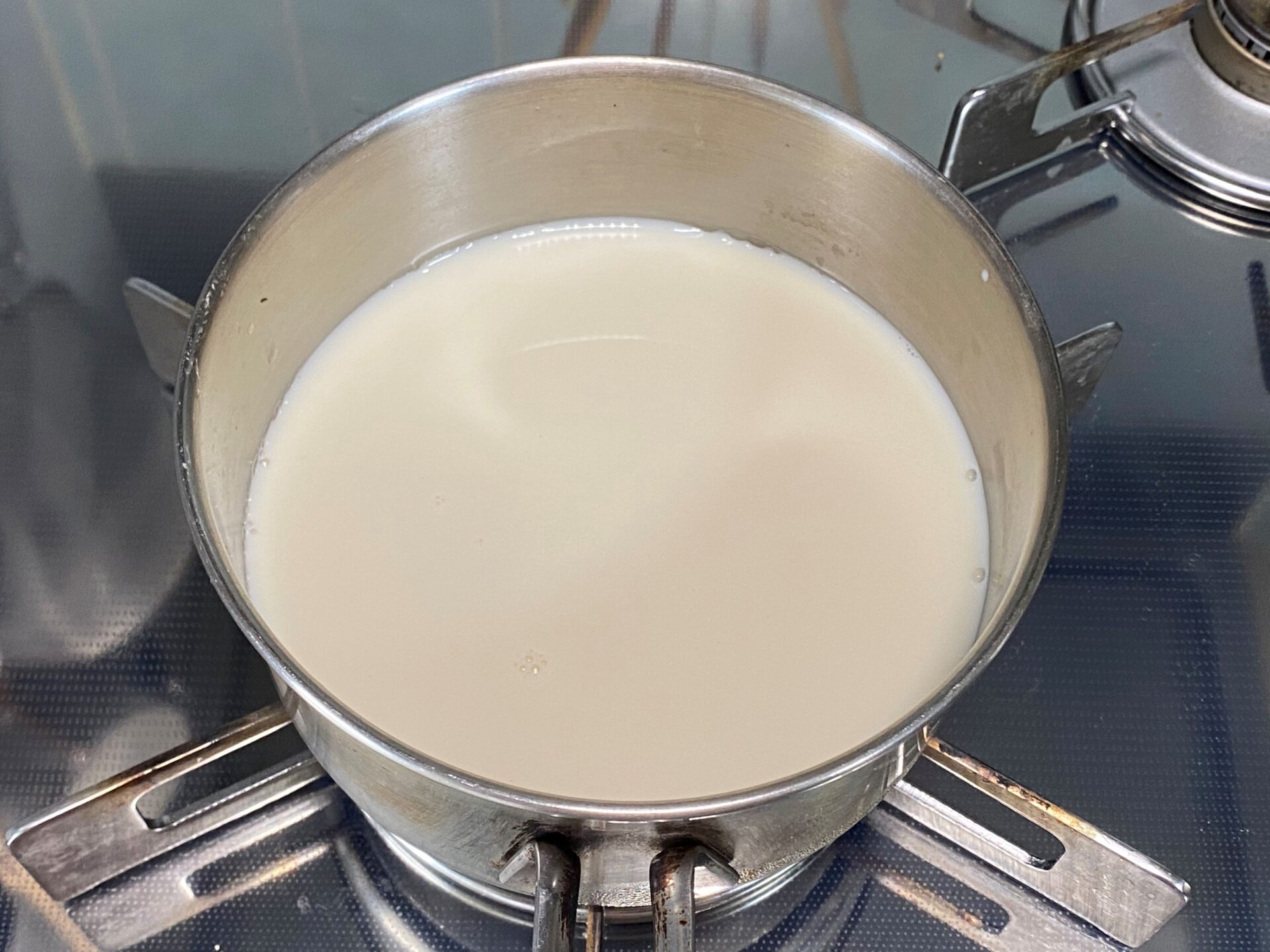 鍋に牛乳、砂糖を入れて火にかけ(中火)、沸騰直前まで温めます。砂糖が溶けたら火を止め、ふやかしたゼラチンを加えて溶かします。