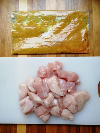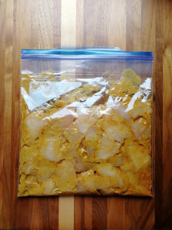 3.鶏肉をAに入れ袋の上からよく揉みこみ、2時間冷蔵庫で漬け込む。(この時点で冷凍保存可能)