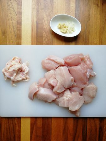 1.鶏むね肉は皮を取り除き、大き目の一口大に切る。にんにく、生姜はすりおろす。