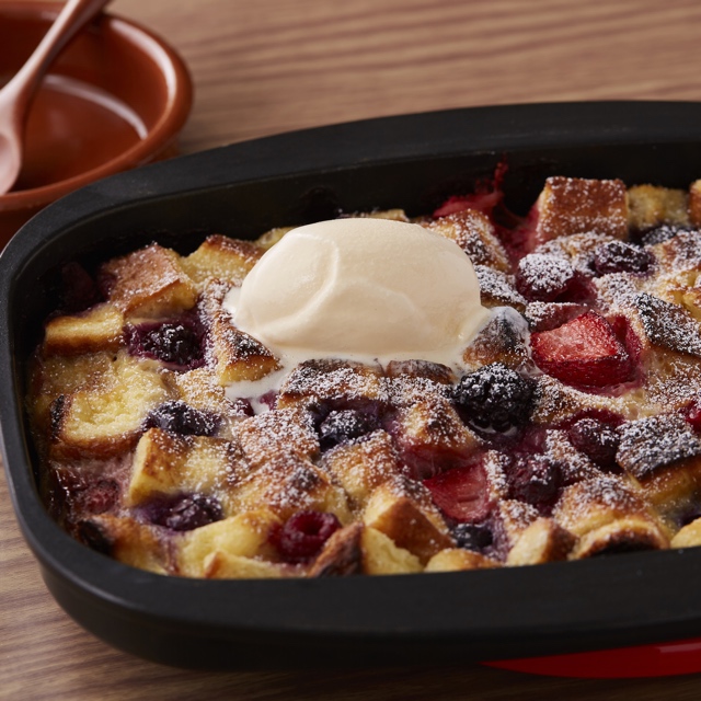 ミックスベリーを他のフルーツにしたり、メープルシロップをかけたりたくさんのアレンジができそうですね。ぜひ、焼きたてあつあつのうちにお召し上がりください♪