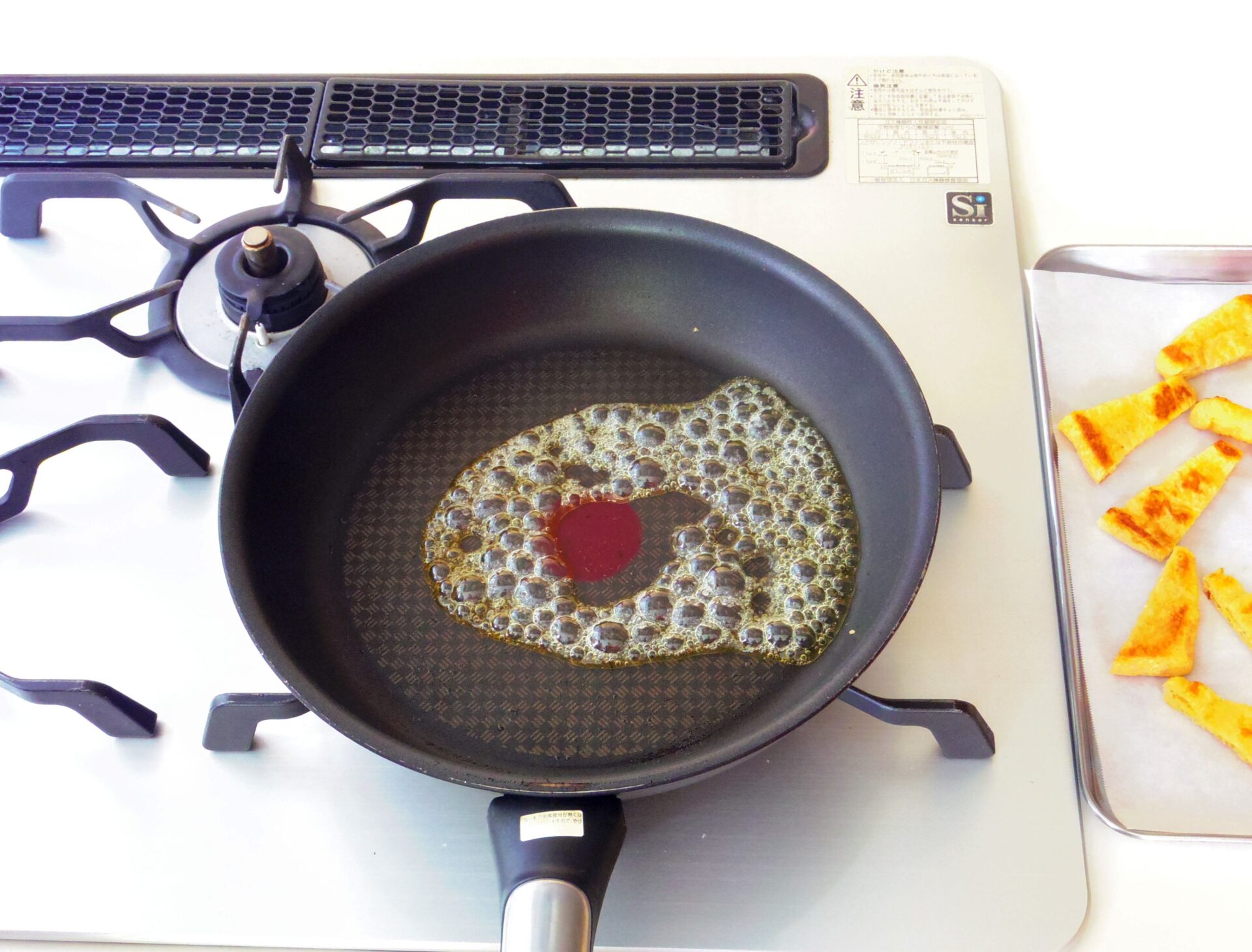 カラメルは、上白糖を溶かしている間にヘラ等で混ぜると結晶化してしまうため、フライパンを動かして混ぜると良いでしょう。あぶり高温炒め機能を使うと便利です。