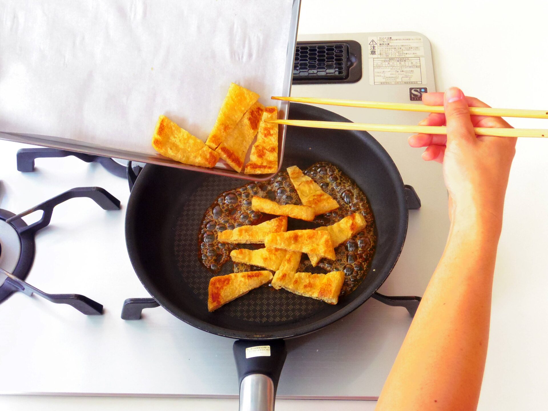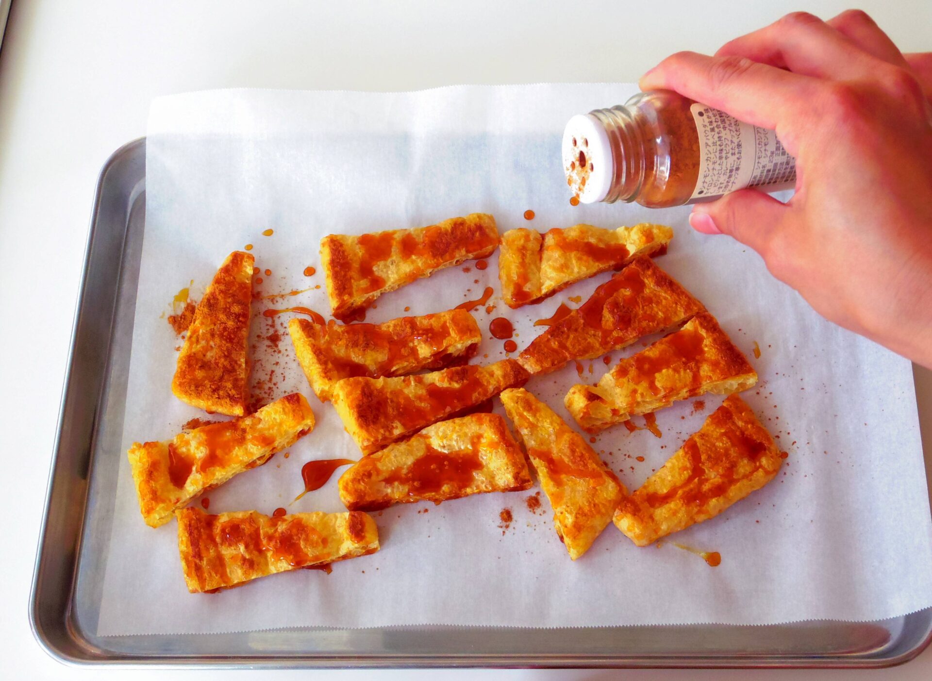 バットに取り出し、フライパンに残ったカラメルを油揚げにかけます。シナモンをふり、粗熱をとります。