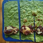 あんこ・くるみ・栗をのせ、くるくると巻く。巻き終わりは下にする。