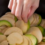 アボカドは皮をむいてたねを取り除き、5mm幅にスライスしたらじゃがいもの隙間に挟み込む。