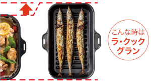 広くて大きいラ・クックグラン なら、鶏の胸肉やもも肉も丸ごと野菜と一緒に調理でき、大きなサーモンの切り身もキレイ に並べて焼けます。