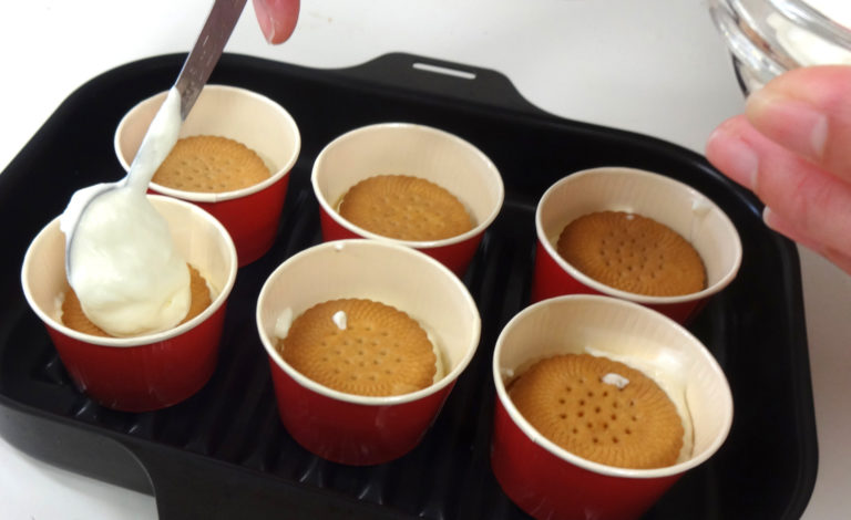 ラ・クックに耐熱カップを並べ、ビスケットを1枚入れてエスプレッソソースをかけ、半量の②を入れます。