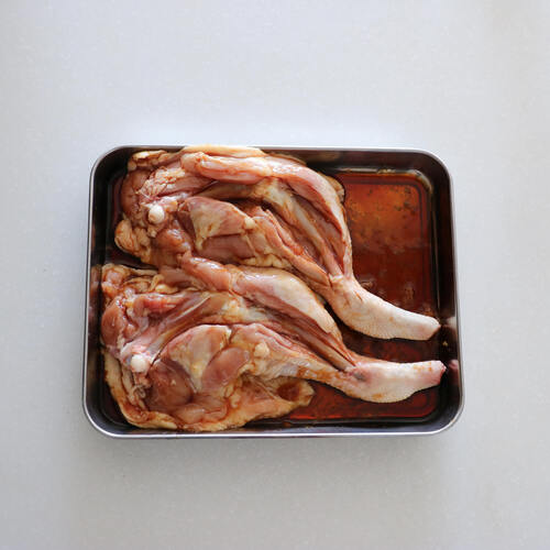 2を並べてマルチグリルのプレートに置き、マルチグリルのオートメニュー[鶏もも焼き]で加熱する。