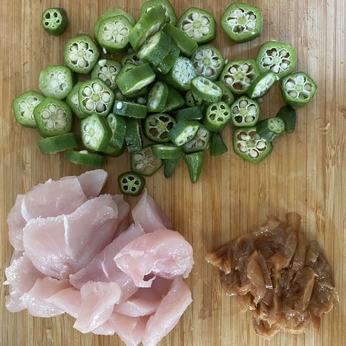 オクラは薄切りにする。梅干しは種を除き、果肉は包丁で叩く。ささみはそぎ切りにする。