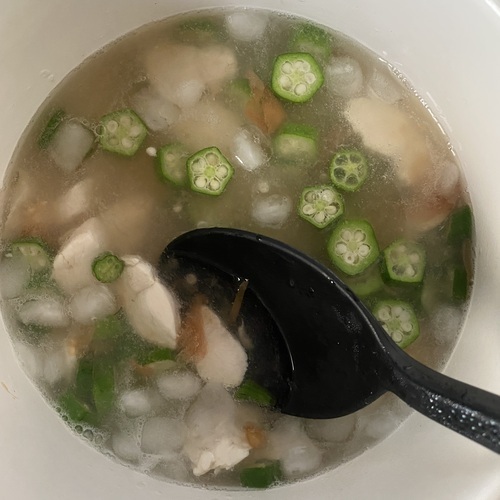 オクラを加えひと煮立ちさせたら氷を加えて、急冷する。