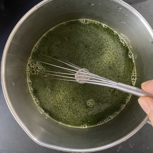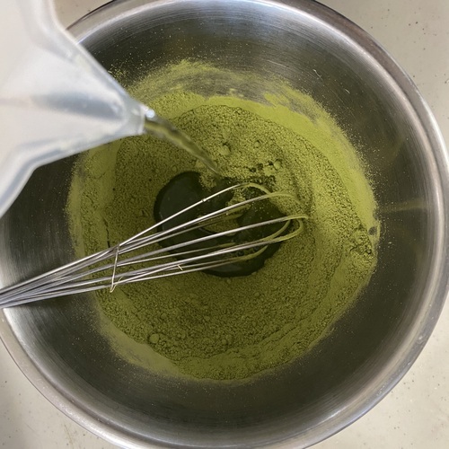 ボウルにきび砂糖と抹茶を入れ泡だて器で良く混ぜる。水を少しずつ加えながらさらに混ぜ、小鍋に移して中火にかける。