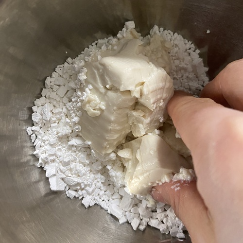ボウルに白玉粉と絹豆腐を入れてなめらかになるまで手でよく混ぜる。耳たぶくらいの柔らかさになるように調整する。(固ければ水、やわらかければ白玉粉を加える)