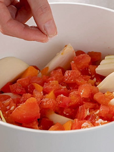 鍋にオリーブオイルを入れ、1.のにんにく、玉ねぎ、にんじん、トマトの順に重ねたら、塩の半量をふる。その上にキャベツ、しめじの順にのせ、残りの塩をふる。