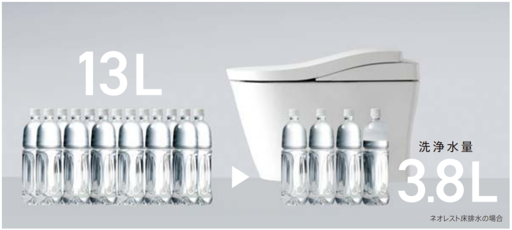 TOTOの最上位機種「ネオレスト」シリーズの場合、1回あたりの洗浄水量はわずか3.8L(床排水の数値。壁排水は4.8L)。13L便器からおよそ1/3、8L便器からおよそ半分と、大幅な節水を実現できます。