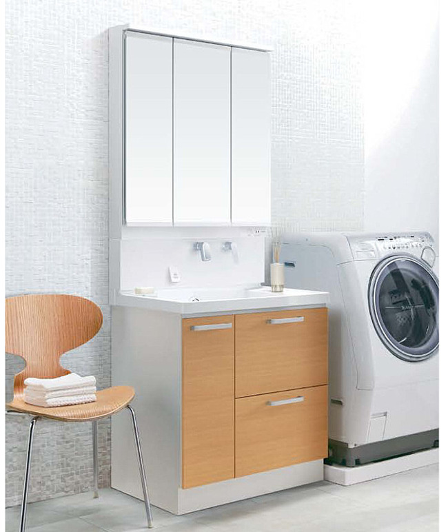 また、排水管の配置や構造を見直すことで、広い収納スペースを確保。間口750mmの場合に選べる三面鏡は、鏡裏に小物をたっぷり収納できます。