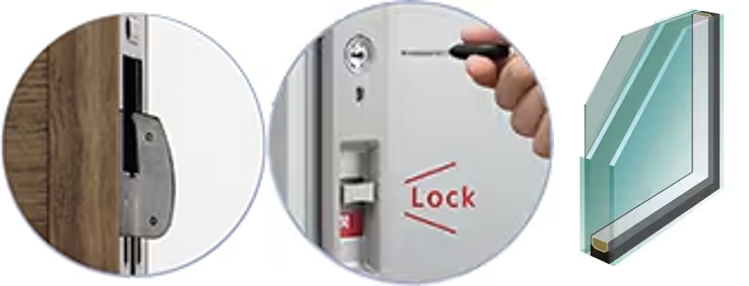 ドアは抜けにくい鎌錠が採用されており、「セキュリティサムターン」も装備されています。オプションで「防犯合わせガラス」を選ぶことも可能です。