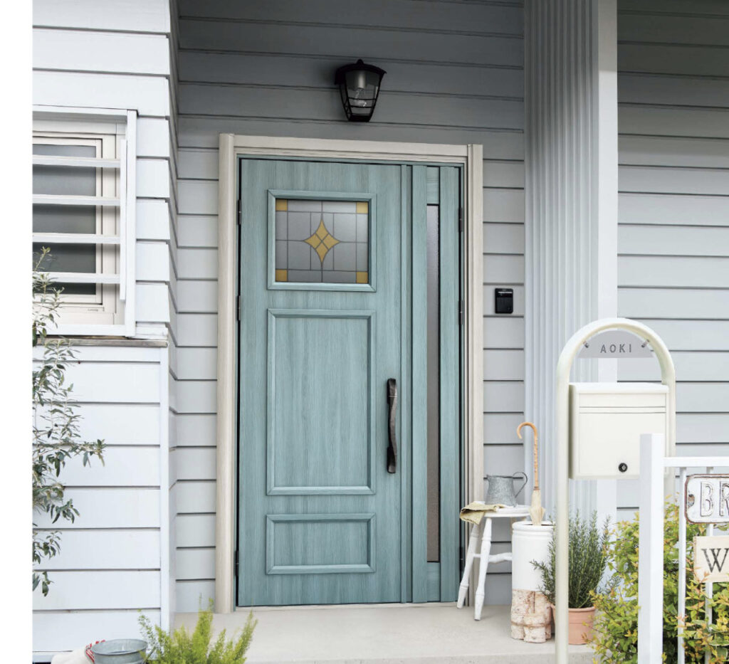 リフォーム用玄関ドア「ドアリモ」は、ベーシックカラーの木目柄・アルミ色のほかに爽やかなアイスブルーのカラー(アイスブルーノーチェ)がラインナップされています。