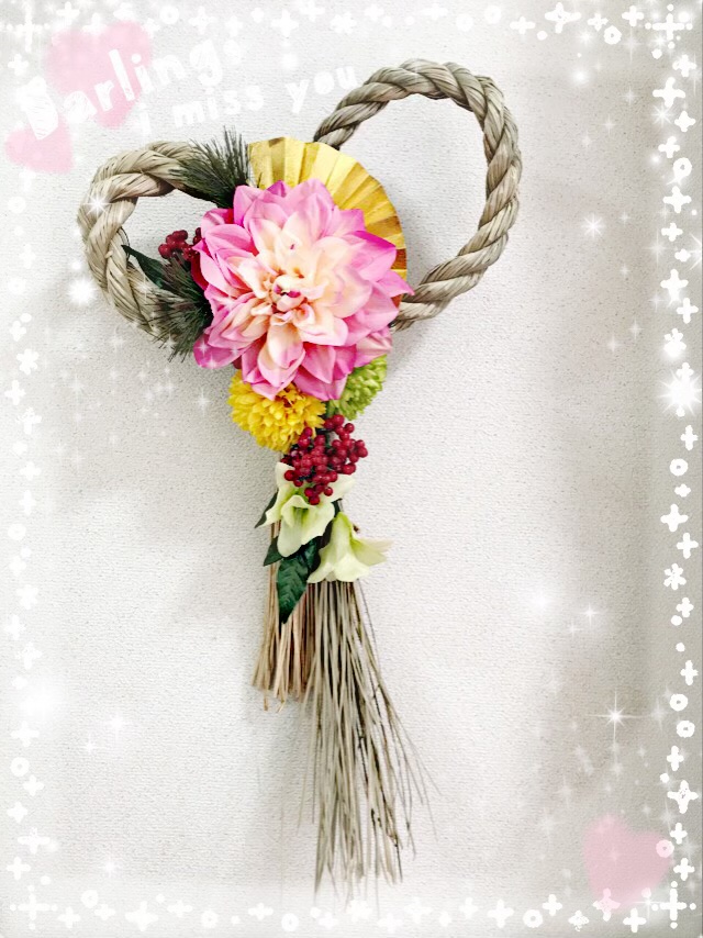 1本のしめ縄とワイヤーで形を作り、アーティシャルフラワーで飾り付けを行なったかわいらしく華やかなお正月飾りです。