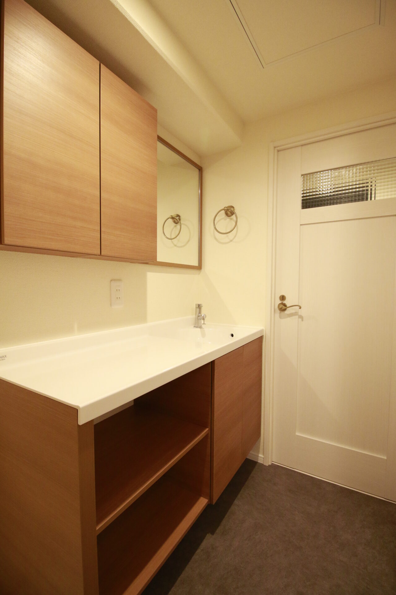 お掃除のしやすい洗面化粧台に加え、ドアや照明も明るく一新することにより清潔感のある空間に仕上げました。