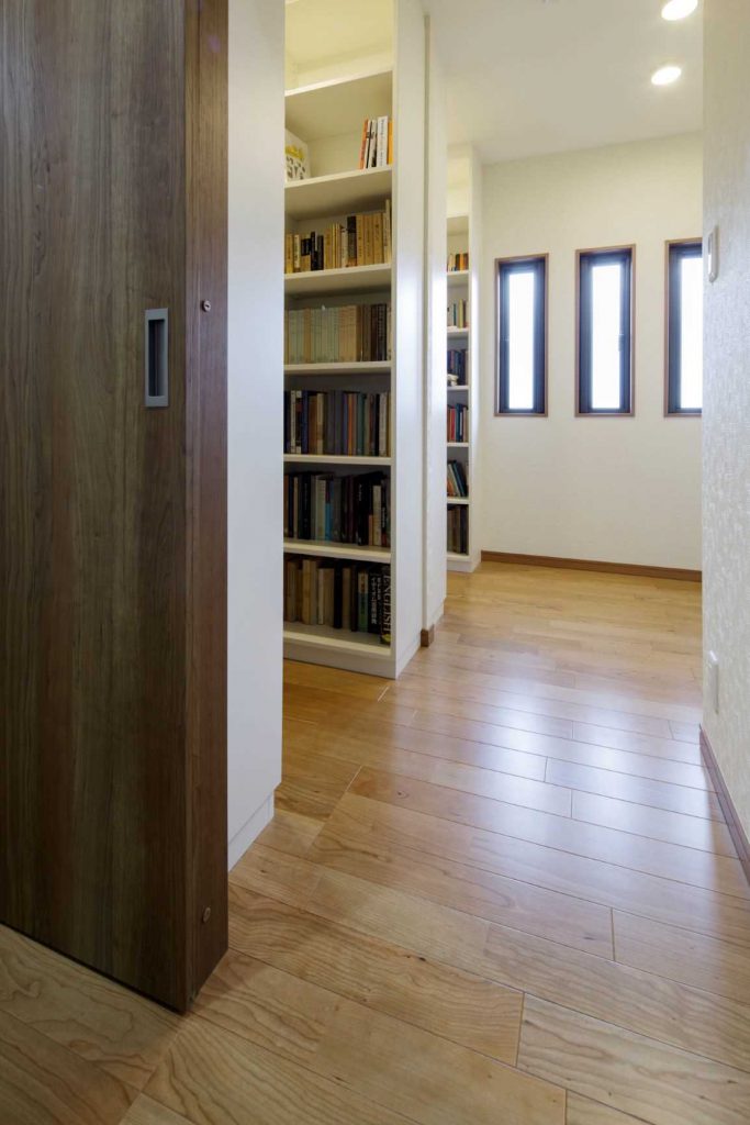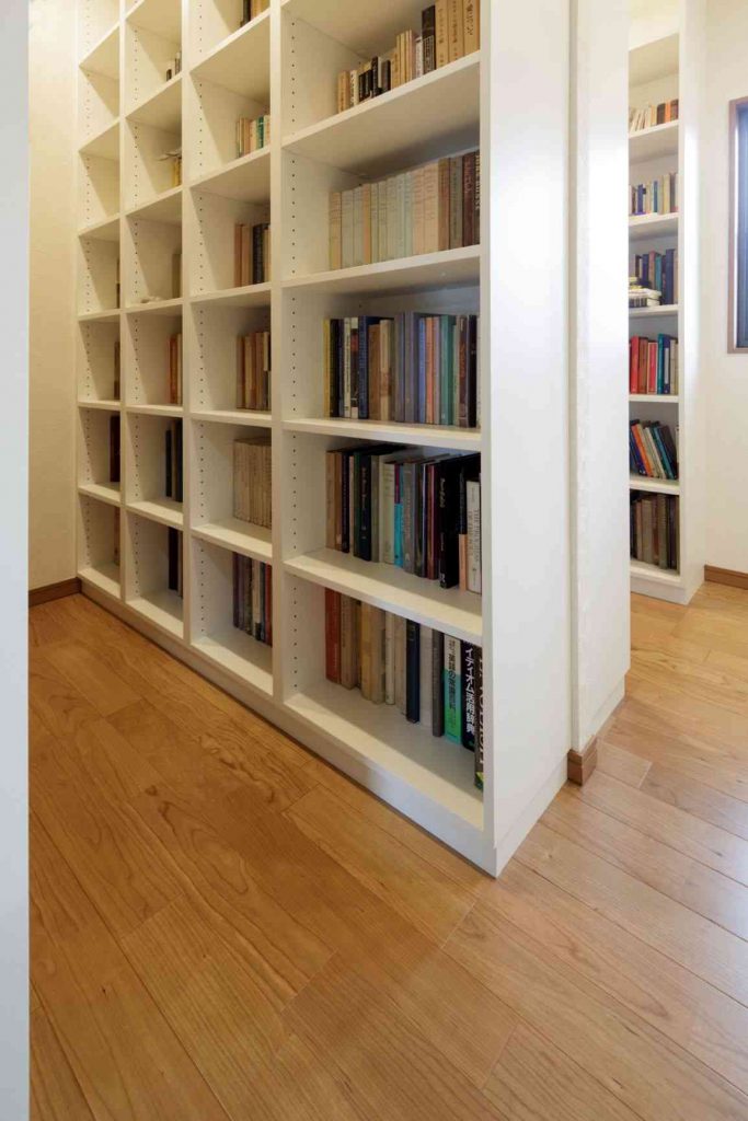 造り付けの本棚を部屋いっぱいに天井まで配置し大容量の書庫を実現。