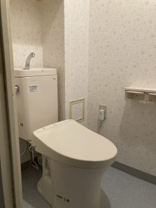 トイレの配管スペースの壁がトイレタンクのすぐ真横にあるため、手洗いタンクは細い形状のものを採用しました。手洗いレバーの位置を左側につけることで空間の幅におさめることができました。