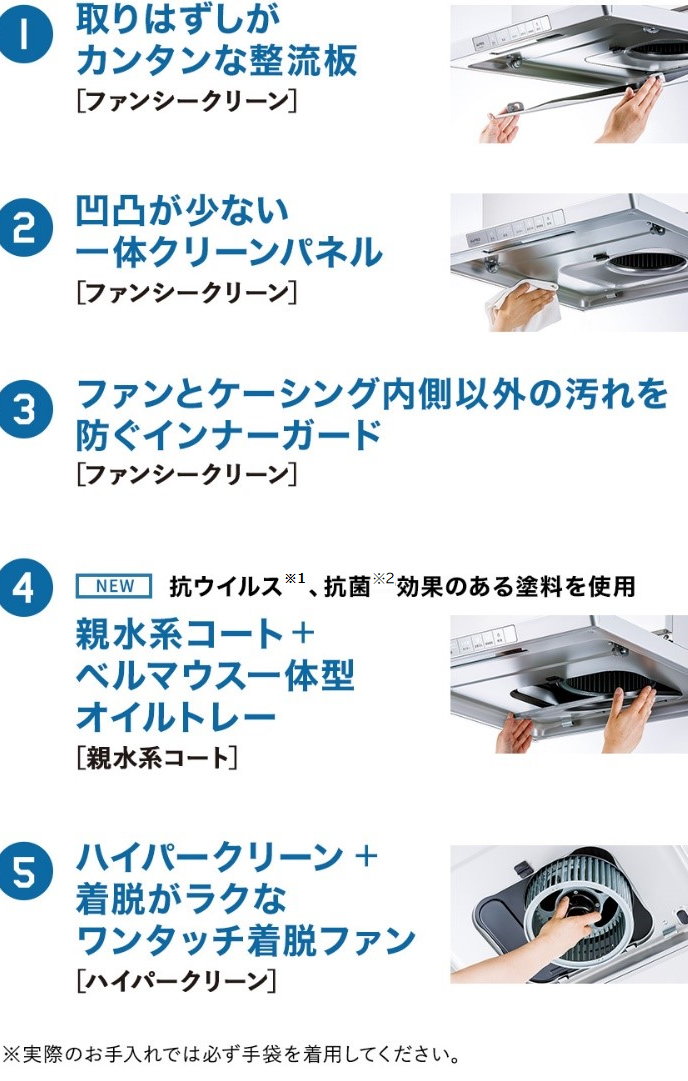 ※ 整流板、一体クリーンパネルは、最初に油煙を受け止める部分です。汚れたらその都度お手入れをしてください。