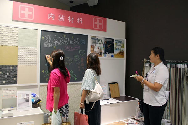 「住宅ドック」の中でも壁紙クロスやフロア材など、内装材のご紹介コーナーが人気でした。特にお客さまの目に留まっていたのが「黒板クロス」で、その名の通りチョークで文字や絵が描ける仕様になっているものです。当日は実際にお客さまにチョークで文字などを書いていただき、お楽しみいただきました。