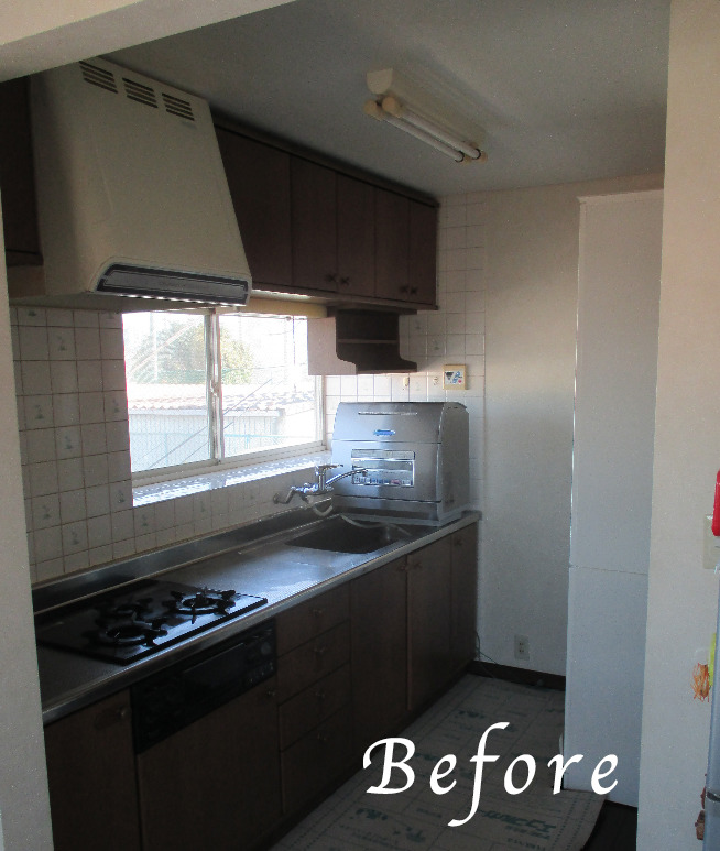 (1)スペースを取っていた食洗器を撤去し、吊戸棚の下に水切り棚を設置。