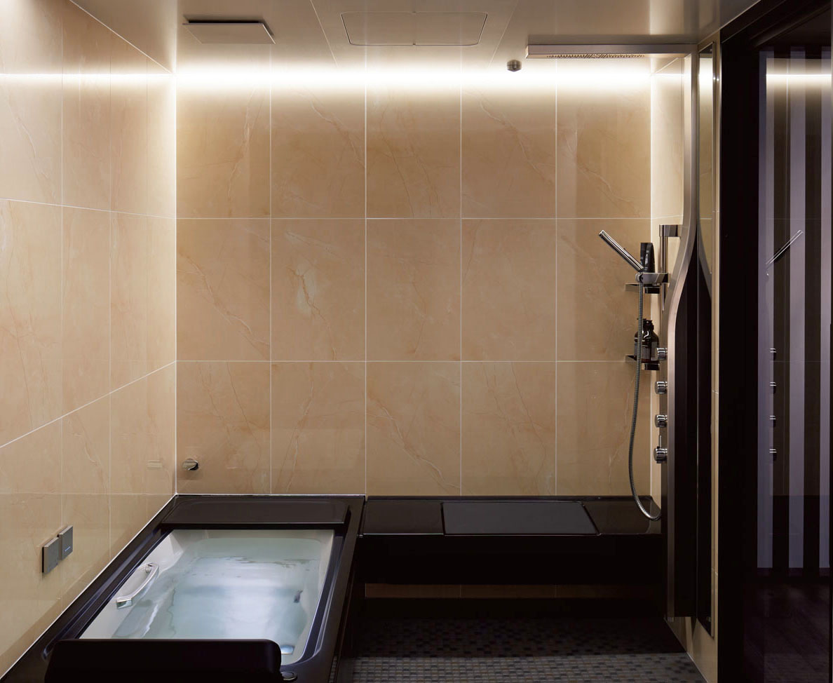 温泉やスパリゾート施設で経験された、あの打たせ湯の心地よい感触。自宅のバスルームでその心地よさを味わうことができるのが、アクアタワーの「打たせ湯」です。ベンチカウンターに腰かけて、湯の感触にリフレッシュする自分を感じる。心地よいお湯の刺激感と、期待されるマッサージ効果。浴槽だけでない、バスルームでのくつろぎ。