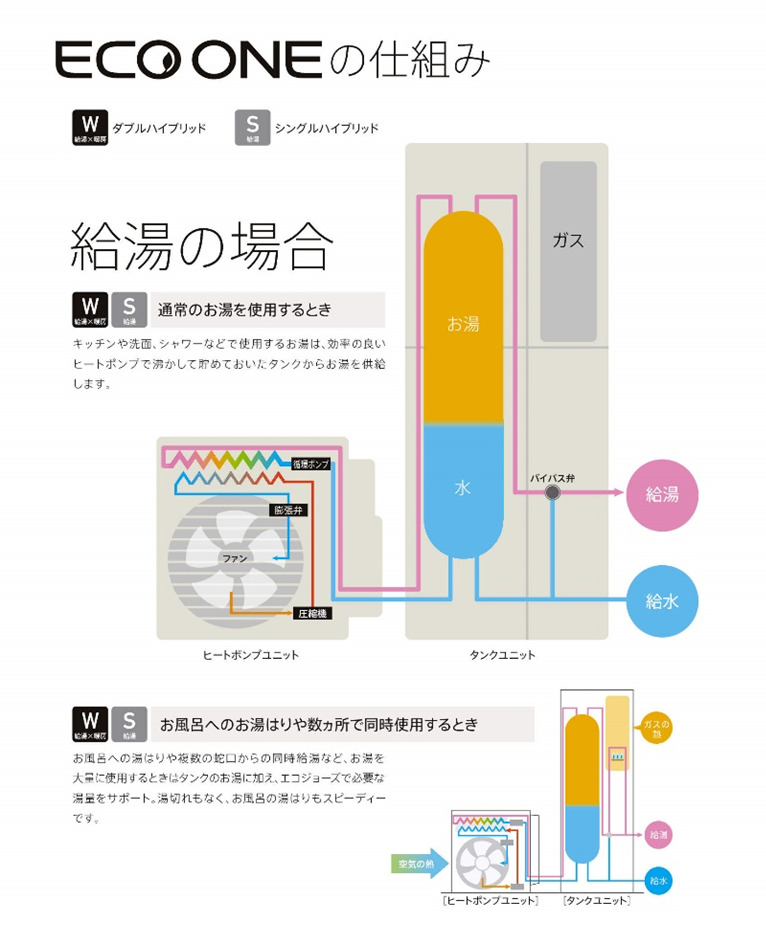 エコワンが「ガス」を使ってお湯を沸かすときは“エコジョーズ”で沸かしており、「電気」を使ってお湯を沸かすときは“エコキュート”と同じくヒートポンプでお湯を沸かします。