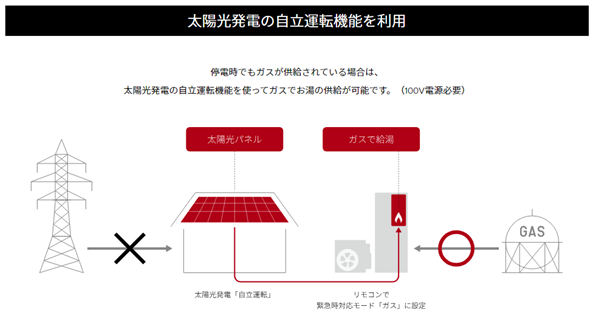ご自宅に太陽光発電の設備がある場合は、太陽光発電の自立運転機能を利用することでガスを使ってお湯を沸かすことができます。