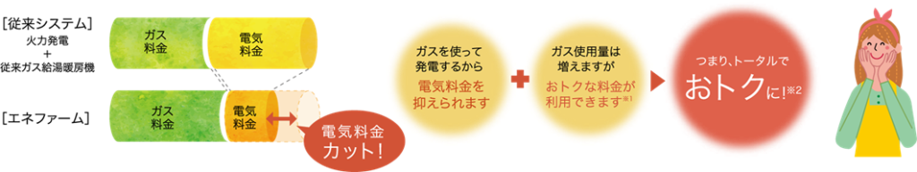 必要となるエネルギーはガスなので、ガスの使用量は増えますが、その分自宅で発電した電気を使用することでこれまで購入していた電気代を削減※2できます。