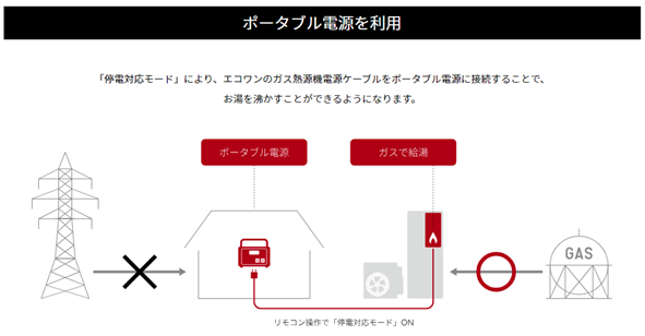 ご自宅にポータブル電源がある場合は、「停電モード」によりエコワンのガス熱源機電源ケーブルをポータブル電源に接続することで、お湯を沸かすことができるようになります。