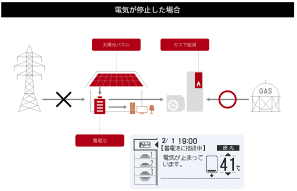ガスと電気どちらも止まってしまった場合でも、蓄電池があればお湯を沸かすことができます。