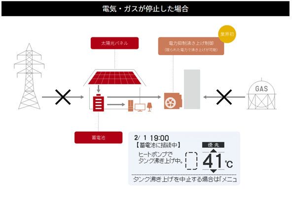 ガスの供給だけが止まり電気が使用できる場合はヒートポンプが稼働してお湯をつくることが可能です。