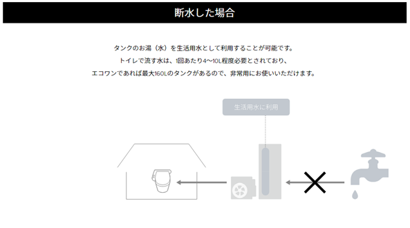断水時にはエコキュートやエコワン同様に貯湯タンク内のお湯(水)を生活用水※3として使用することができます。
