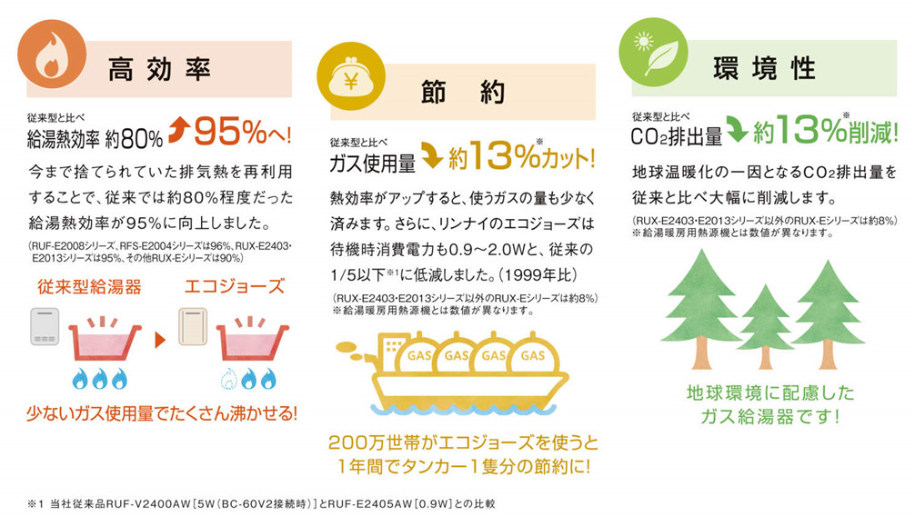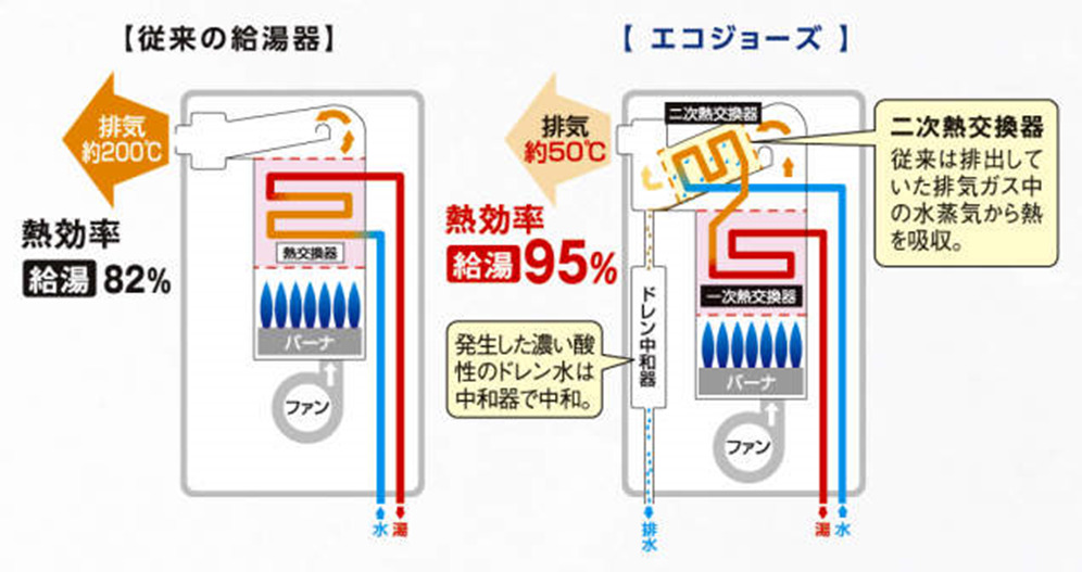 ガスの使用量を抑えることでガス代の節約、さらには廃棄熱を再利用しているためCO2排出量の削減により環境にもやさしく、まさに“エコジョーズ”な給湯器です。