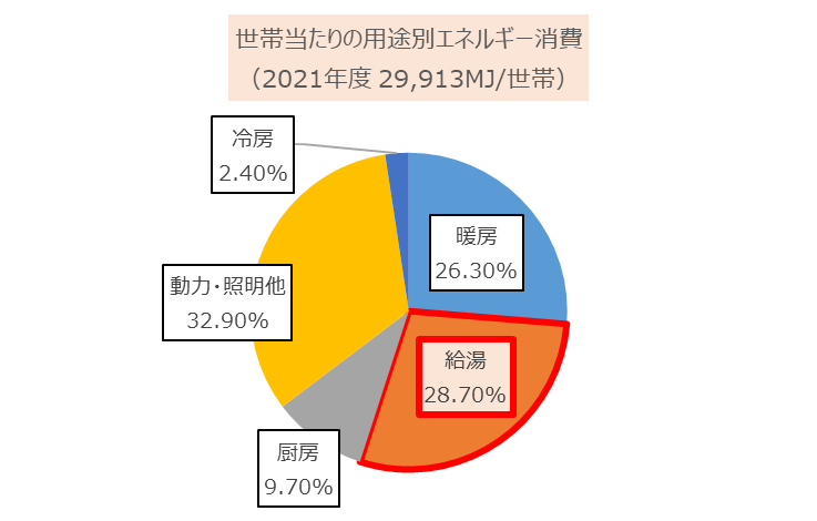 経済産業省資源エネルギー庁による『エネルギー白書2023』の報告によると、“給湯”に使用するエネルギーはご家庭で消費しているエネルギー全体の約3割と多くを占めていることが分かります。