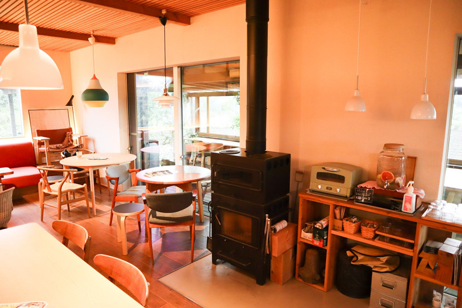 店内は、木製家具を基調とした温もりあふれる空間ながらも、洗練されたデザイン。壁ぎわに置かれたまきストーブが、どこか懐かしい雰囲気をかもし出しています。平日の13時半頃に伺ったところ、数組の女性グループが昼下がりのランチを楽しんでいました。