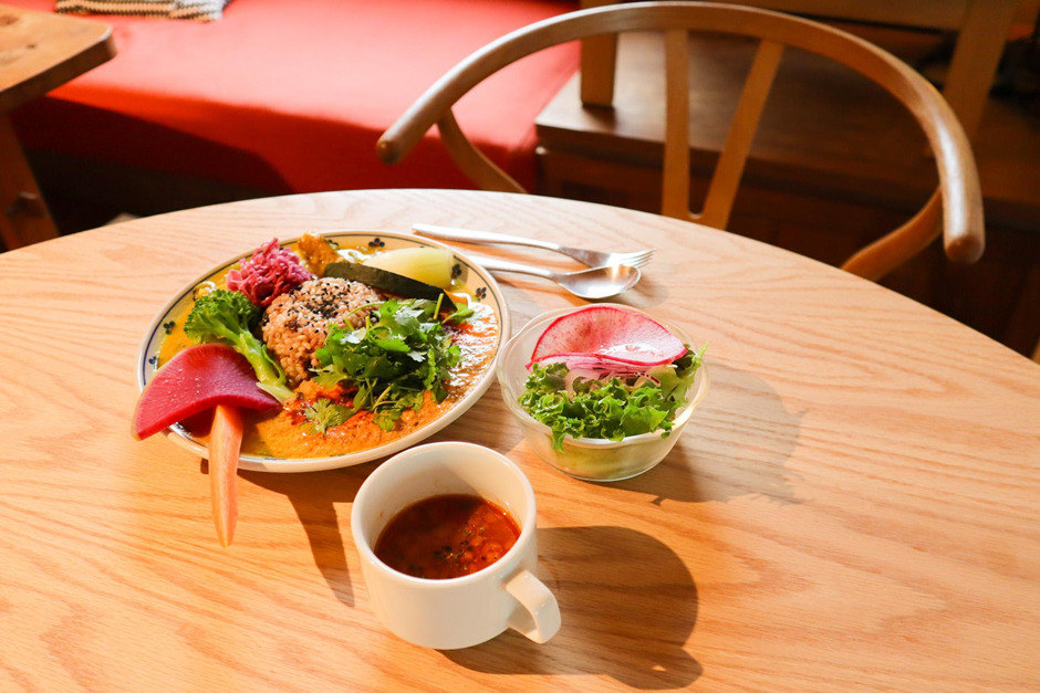 カレーには色鮮やかで大ぶりな野菜がトッピングされていて、食べ応え満点。特に人気なのは「kikoriカレー」で、ガラムマサラの調合から完成まで、2日間もの手間暇がかかっています。「以前、インドに長期出張されていた方から『久しぶりに本場の味に近い、おいしいカレーを食べました!』と言っていただけたことがあって。あのときはすごくうれしかったですね。」