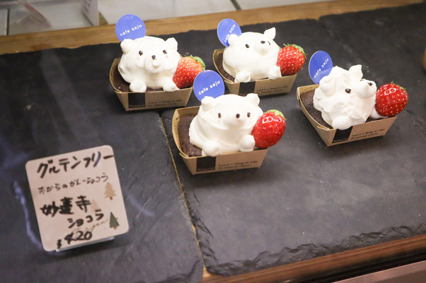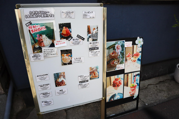 店外のポップに目をやると、見るからにおいしそうなスイーツが並んでいます。筆者が訪れた4月はいちごのシーズンで、写真映えする「グラスショートケーキ」や「”のせすぎ”いちごパフェ」のほか、「桜あんと葉桜塩みるくのかき氷」という、ユニークなメニューもありました。