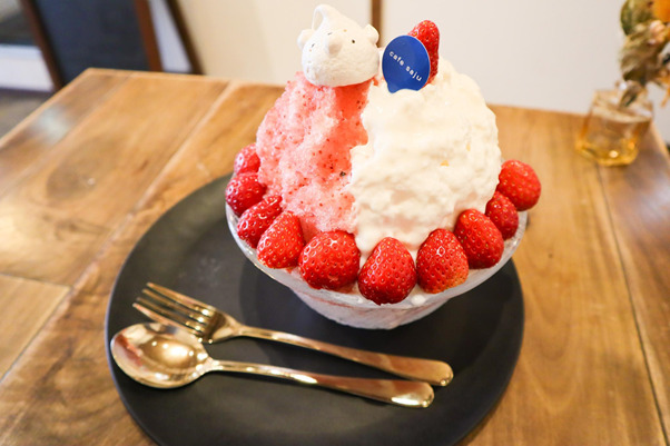 自家製のいちごシロップは優しい甘さで、食べ進めていくと、氷の中にいちごのコンポートが隠されていました。こんなにたっぷりいちごを味わえるとは、なんて贅沢なかき氷でしょうか。かき氷にはミルクとヨーグルトのどちらかをかけられるのですが、今回は珍しいヨーグルトを選びました。さっぱりしたヨーグルトといちごのシロップが合わさると、爽やかさが倍増。ご厚意でミルクも掛けていただいたところ、上品ないちごみるくへと大変身。コンデンスミルクのような後引く甘さではなく、ミルク本来の香りがしっかりと感じられました。